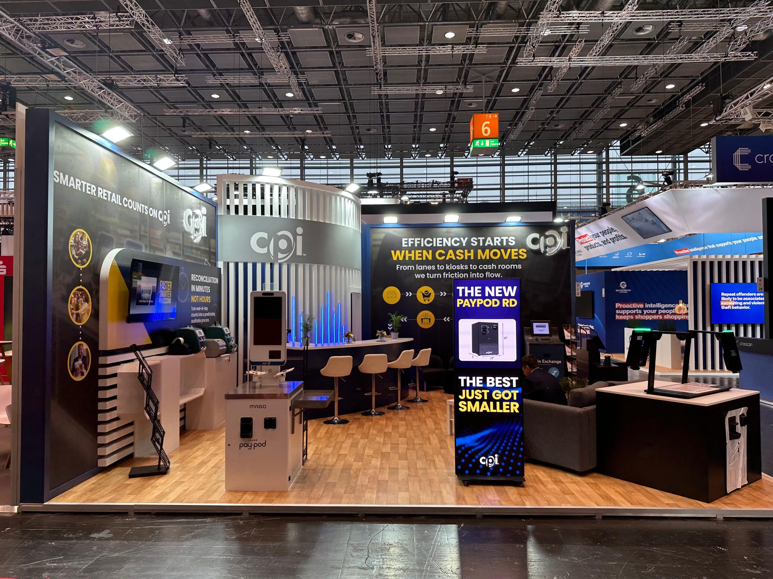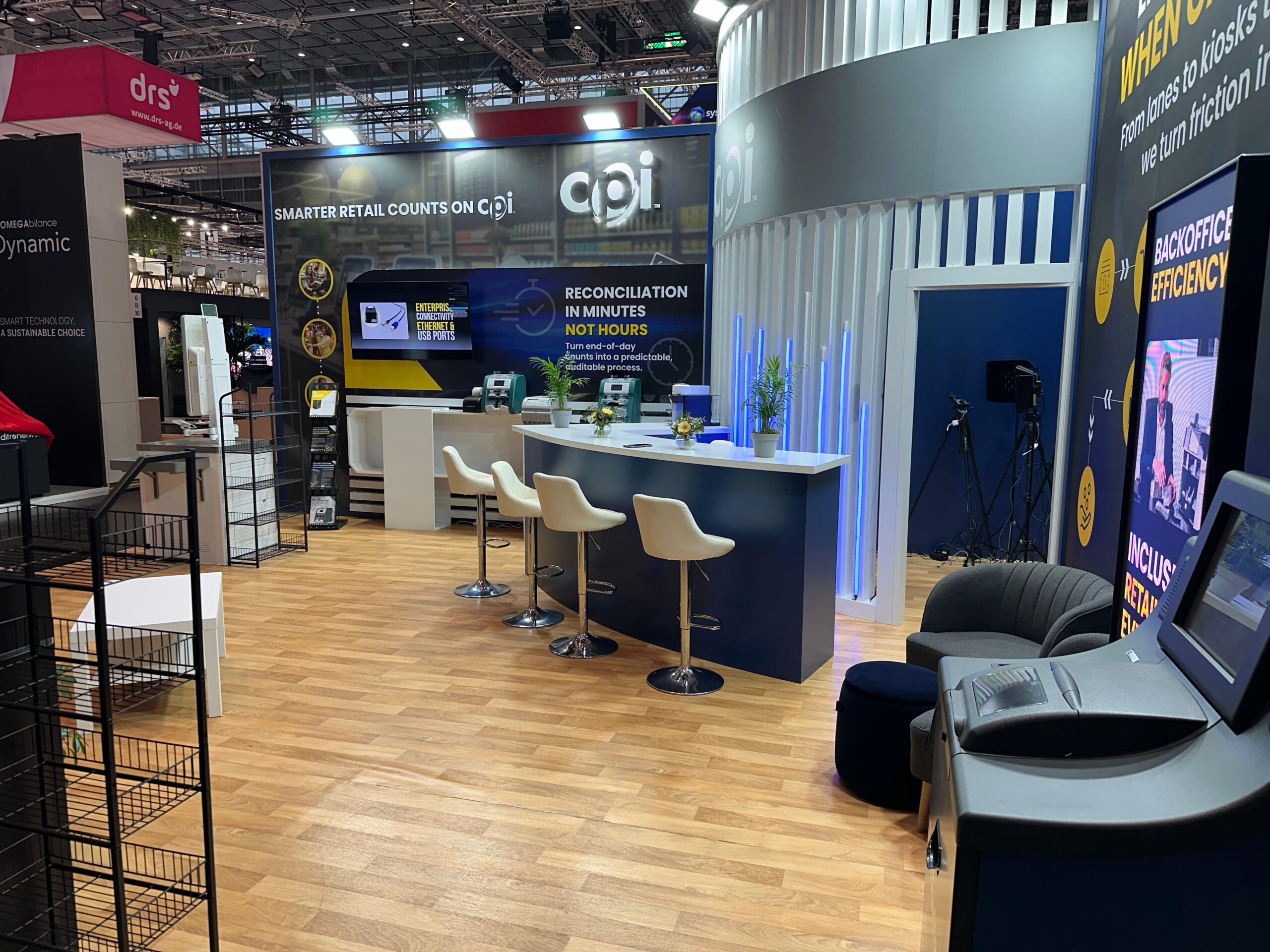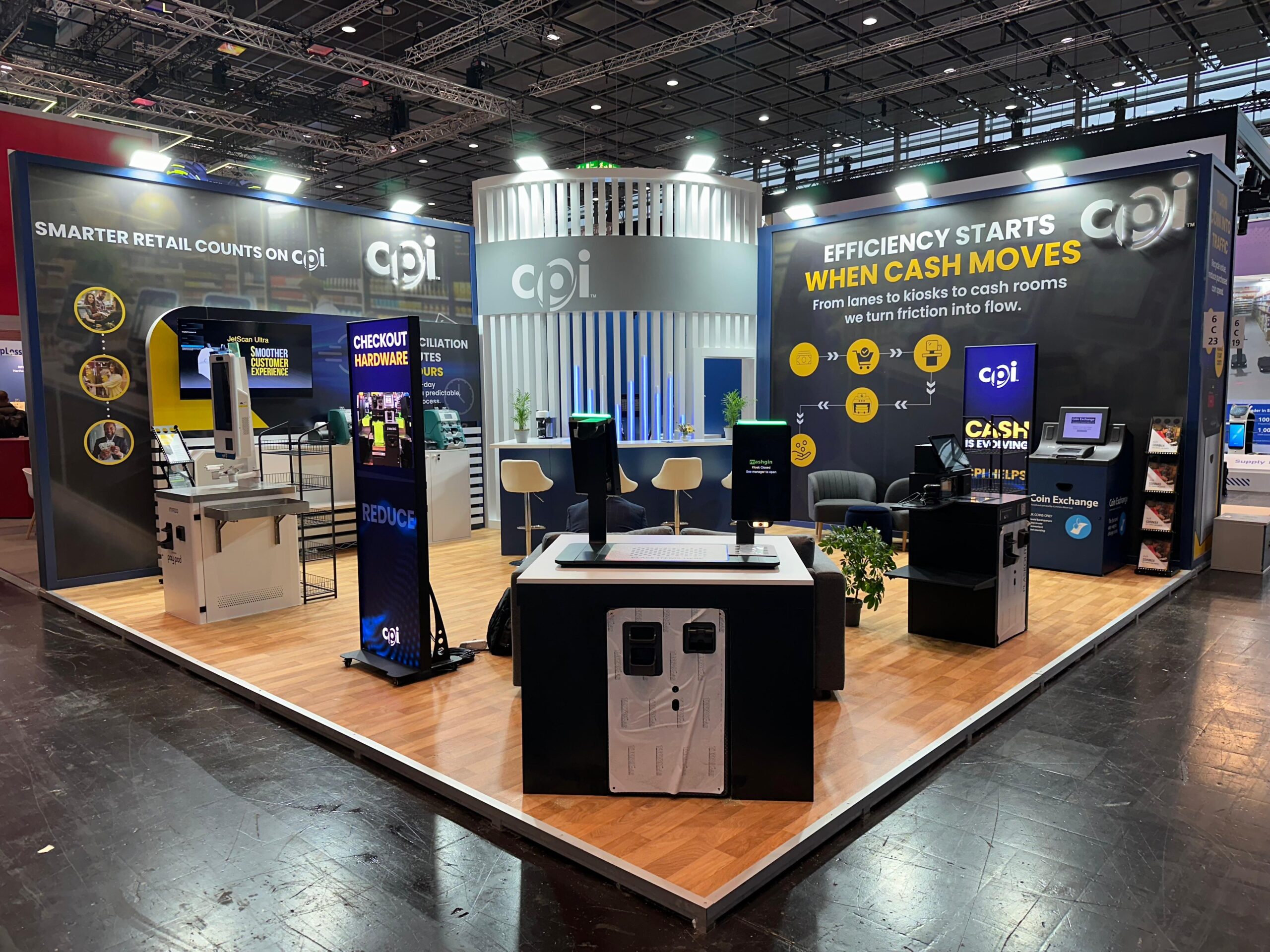 EuroShop representa el máximo nivel de exigencia en el retail global. Para CPI, el desafío consistió en integrar hardware crítico de gestión de pagos en una arquitectura efímera premium sin sacrificar la estética limpia. Nuestra respuesta fue «convertir lo difícil en fácil» mediante una ejecución técnica impecable. Diseñamos una estructura central circular retroiluminada que no solo atrajo el tráfico en el pabellón de Düsseldorf, sino que funcionó como un laboratorio operativo. Gracias a nuestra fabricación propia, ocultamos toda la complejidad del cableado, permitiendo demostraciones en vivo sin interrupciones. Con la gestión integral 360 de iKonic360, el cliente delegó toda la presión logística y el montaje internacional para centrarse exclusivamente en sus objetivos comerciales.