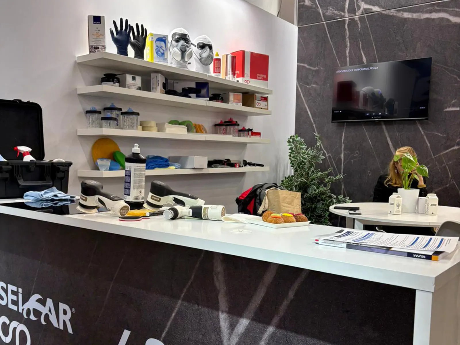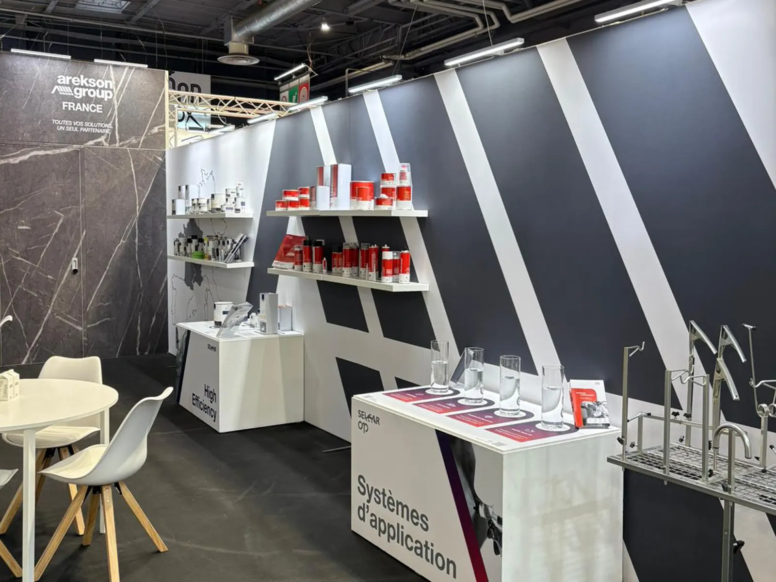 Stand modular, diseño corporativo, podios de exposición de producto y integración de maquinaria.