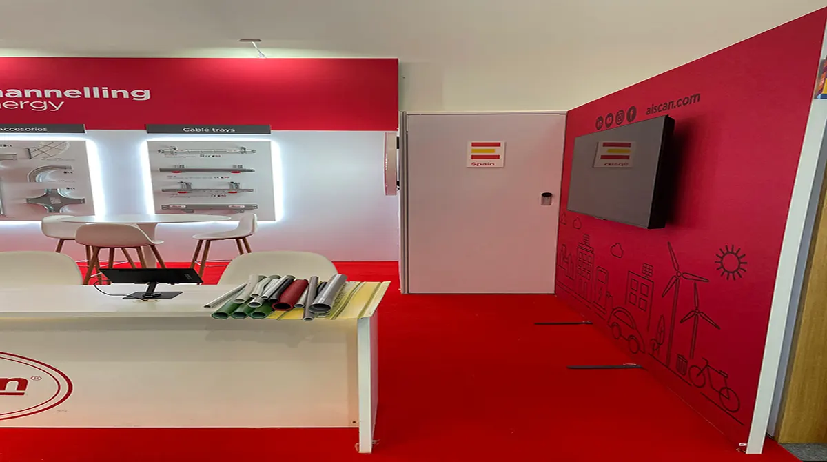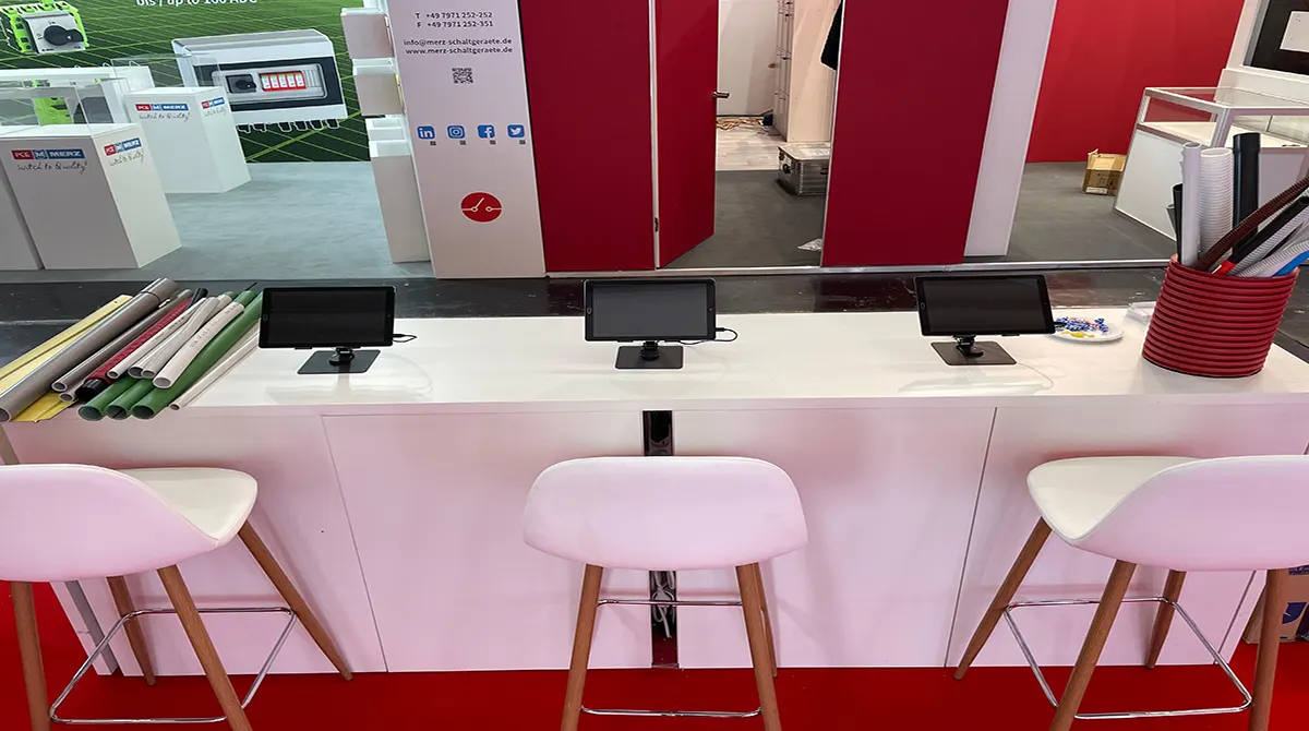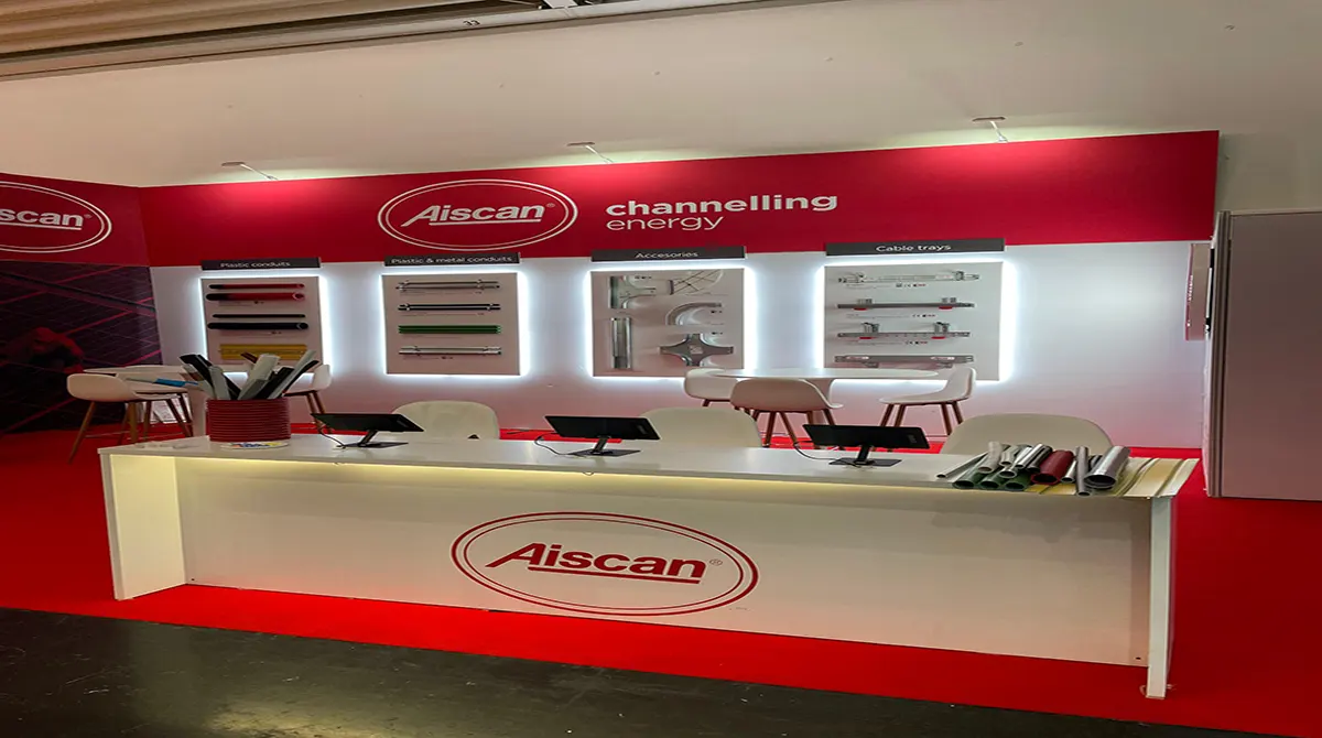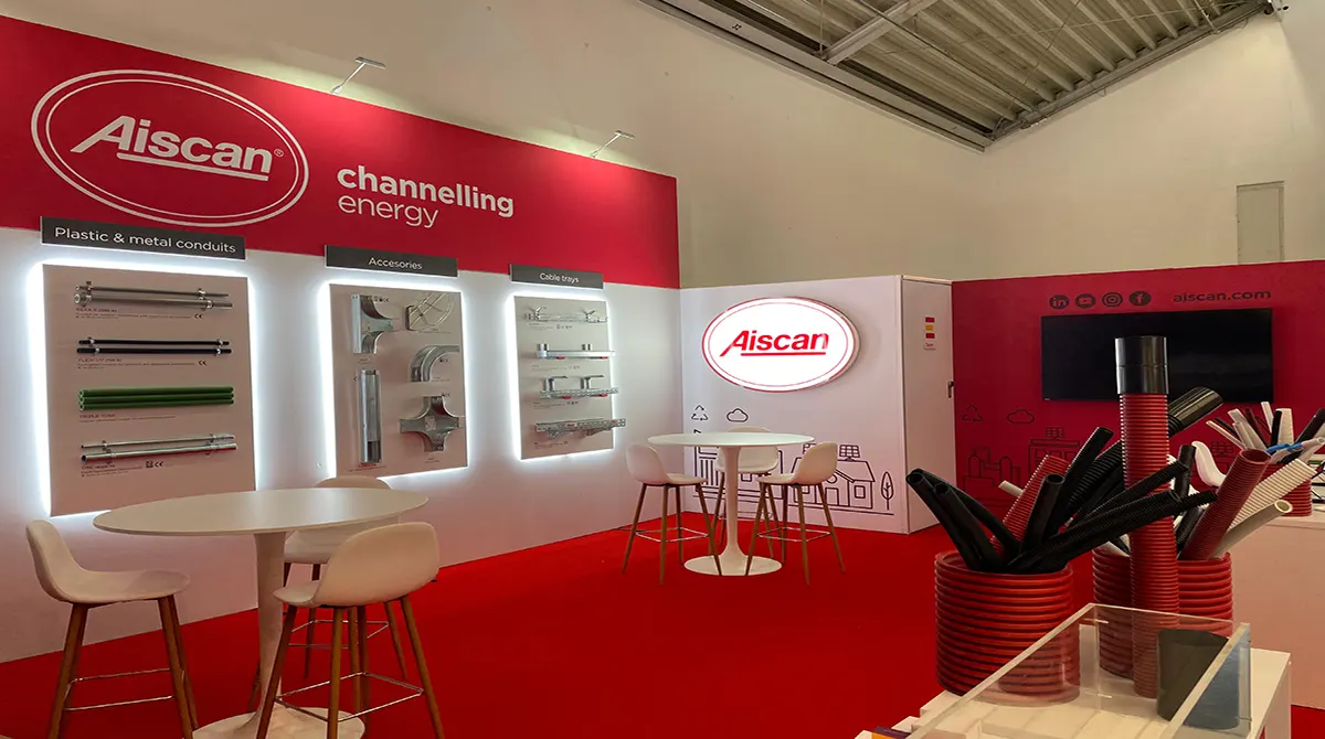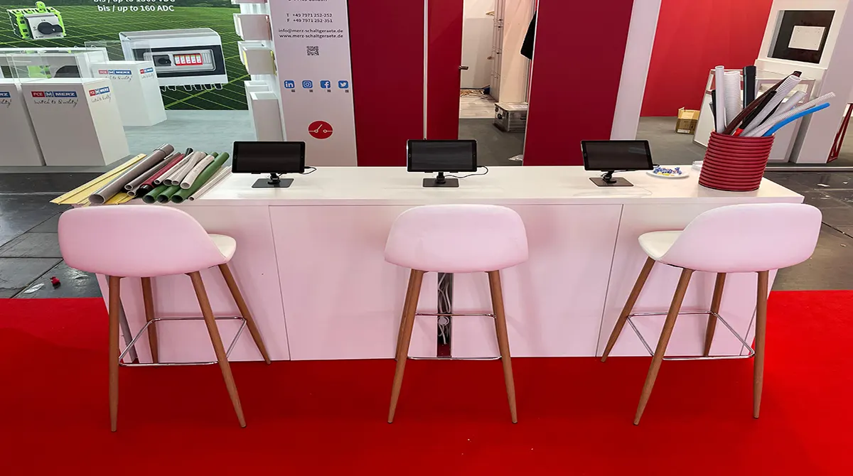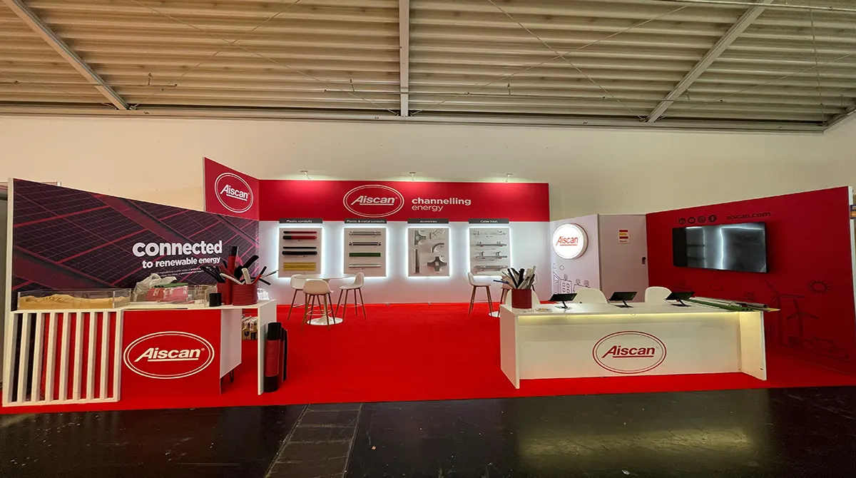 Stand modular con integración de piezas de carpintería, complementado con un logo retroiluminado personalizado que aporta identidad y presencia visual.
