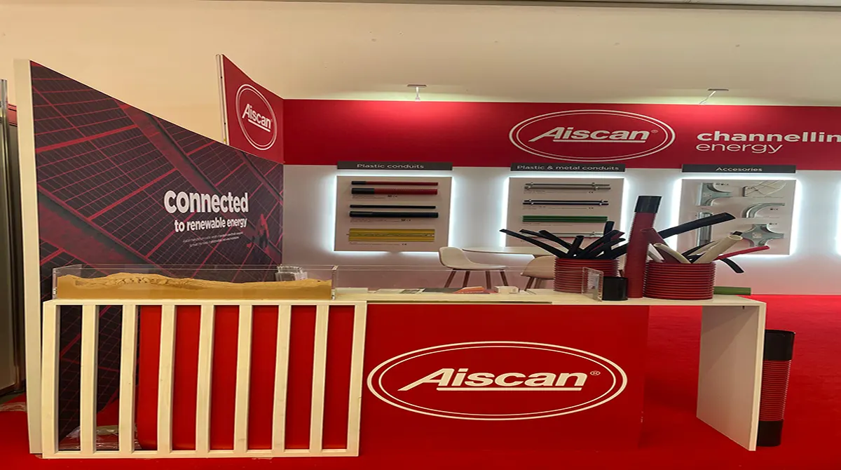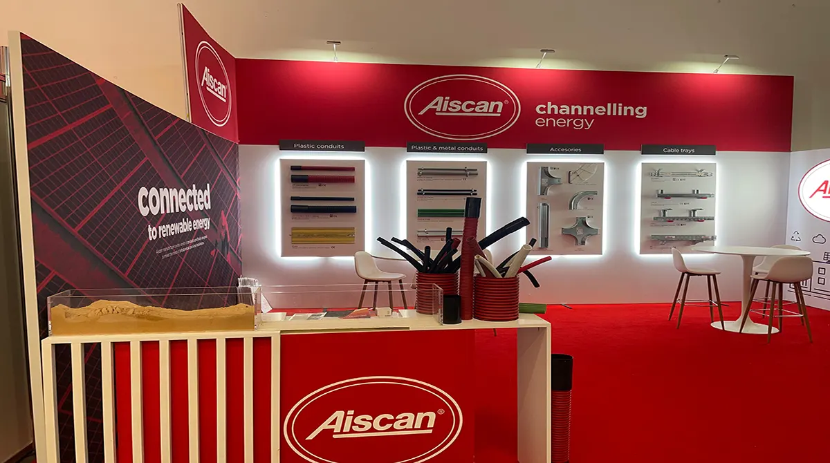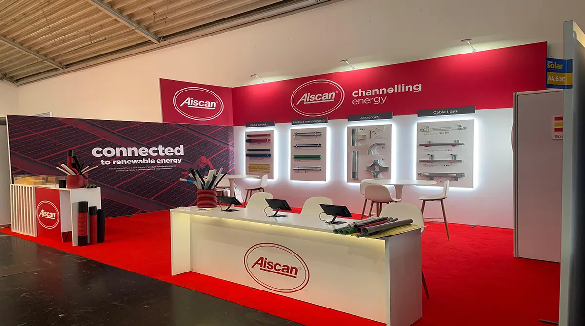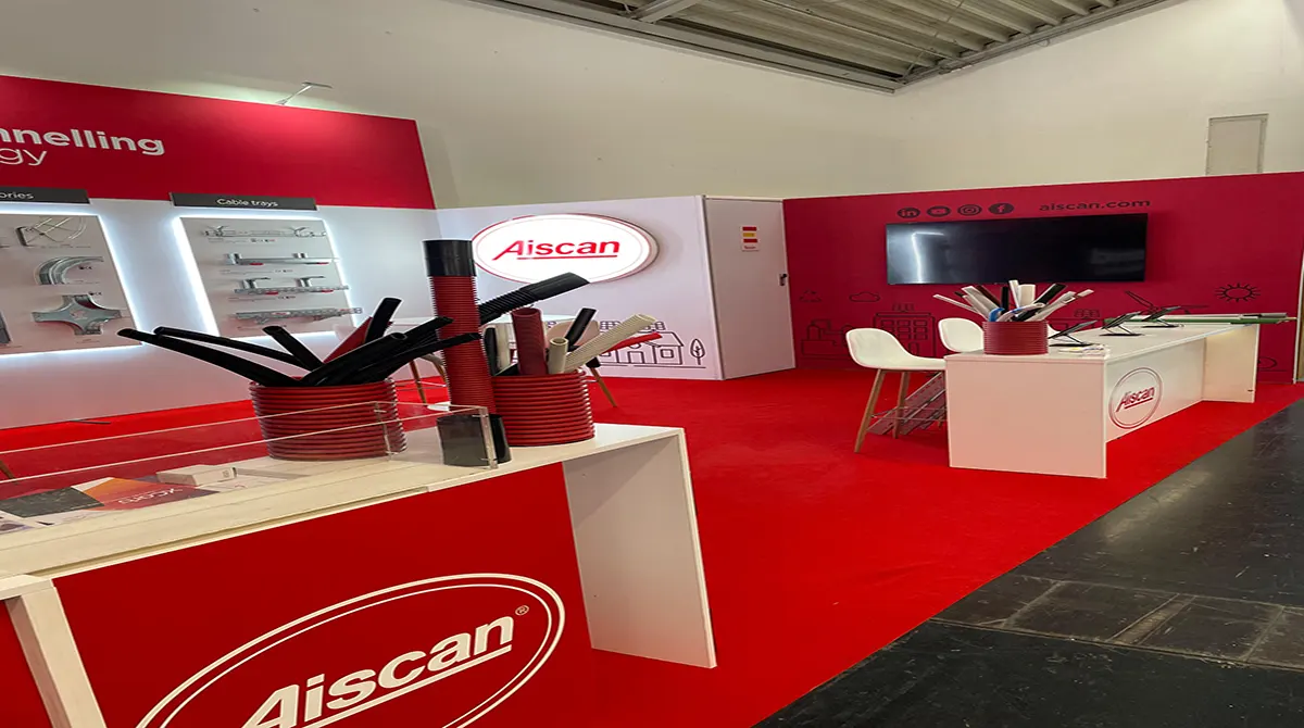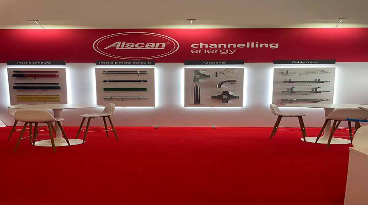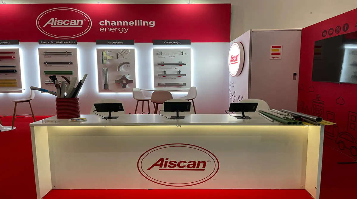 Stand modular con integración de piezas de carpintería, complementado con un logo retroiluminado personalizado que aporta identidad y presencia visual.