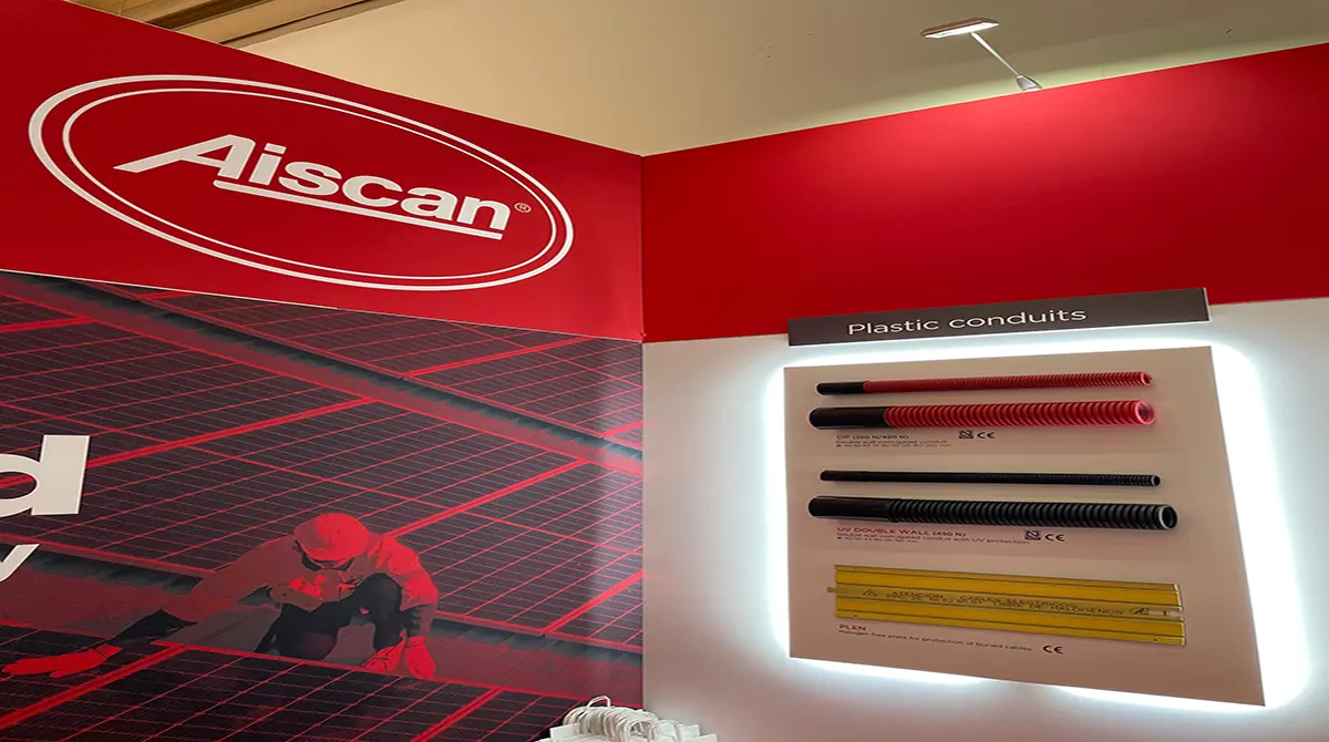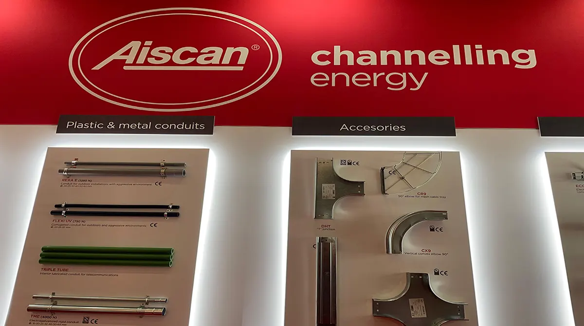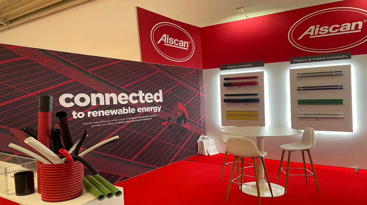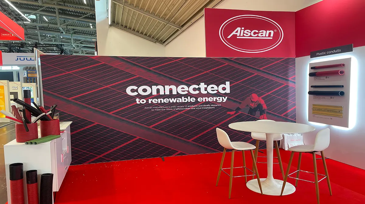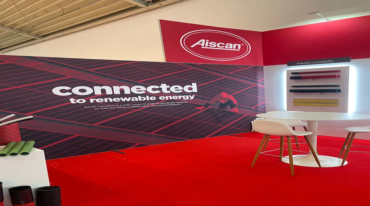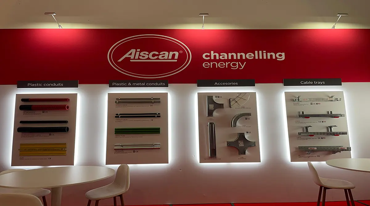 Stand modular con integración de piezas de carpintería, complementado con un logo retroiluminado personalizado que aporta identidad y presencia visual.