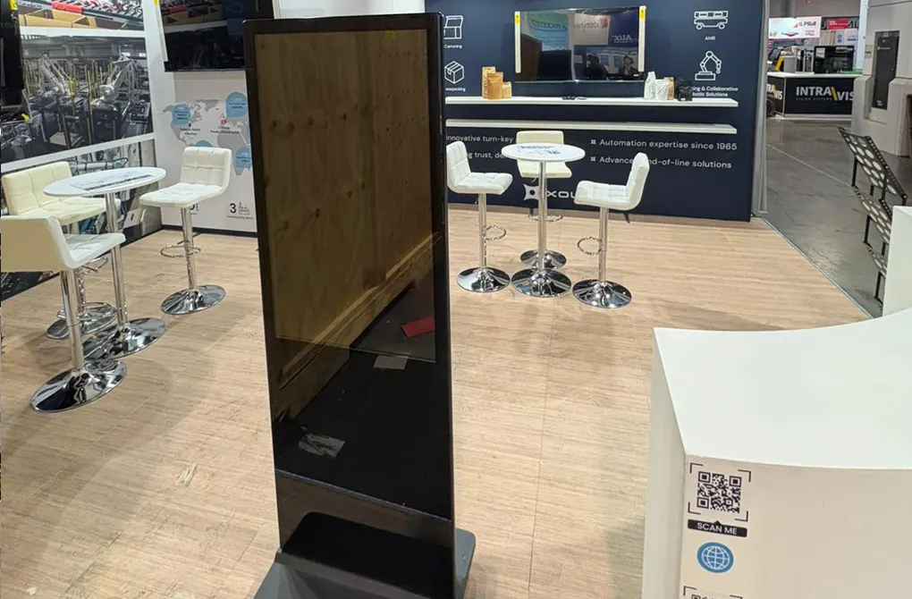 Stand 100% modular , diseño tecnológico con formas curvas, iluminación LED y suelo alzado. El espacio integra pantallas interactivas, mobiliario de reunión y un almacén compacto.